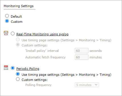 - Periodic Polling, select Custom settings and configure the Polling frequency: How often TOS fetches the configuration from each device.