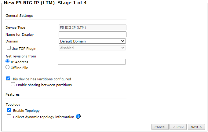 Enter the authentication details needed to connect to the F5 BIG-IP device. The user must have permissions for the commands listed in the prerequisites above.