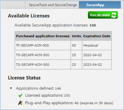 A SecureTrack license grants you a SecureApp Basic license, allowing you to access up to three SecureApp applications (the first three you created in the system, in chronological order). Any additional application you want to create or access requires a separate license, which is installed through the SecureTrack licensing mechanism.