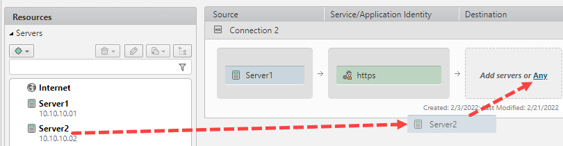 - Source or Destination: Drag and drop servers from the Resources panel to the source and destination of the connection.