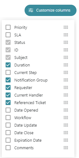 Change default ticket sorting:By default, the tickets are sorted by ID. To sort the tickets by another criteria, hover your mouse over the relevant column heading until an arrow appears. Select the arrow to sort the tickets.