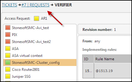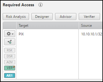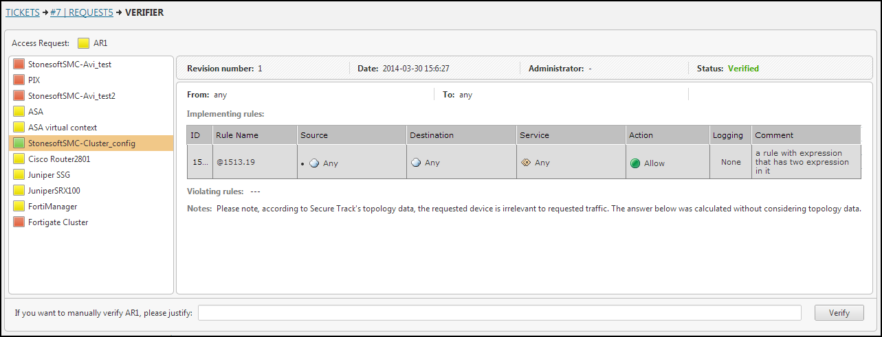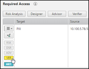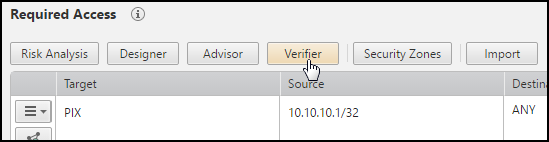When handling a task containing an Access Request field, you can use the Verifier Tool. Use this tool after configuring policies, to test that your changes successfully implement the request. For access requests with application identities whose targets are Palo Alto devices, the verifier considers the application identity. For all other targets, the verifier considers the service that the application identity uses. When a request includes the Internet object, the Designer uses the internet object for the target device to represent the all IPv4 addresses in the Internet in TOS features. (Configurable in SecureTrack for Check Point and Stonesoft; ANY for other devices)