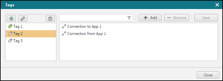 A tag can be associated with multiple connections. The Tags dialog lets you remove one or more connection associations from a tag.