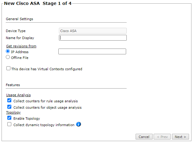 Enter the authentication details needed to connect to the Cisco ASA Firewall device.