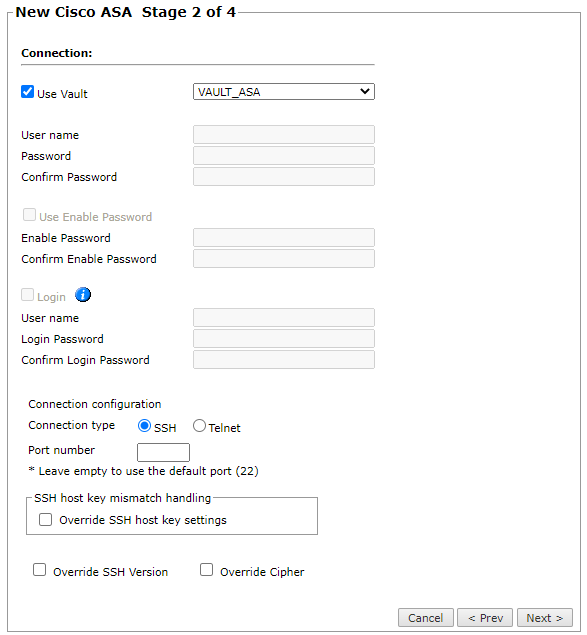 Configure the TOS connection to the Cisco ASA Firewall device, according to the parameters required by the device. To use a vault server that contains access credentials, select Use Vault and select the server. For more information, see Configuring a Vault Server.