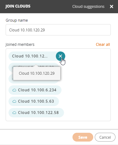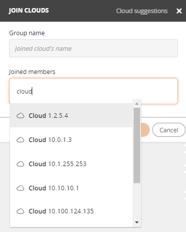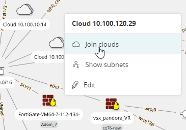 You can join clouds together to connect devices through the clouds. For example, if you have two devices that are each connected to a cloud and you know that the clouds connect to each other, you can join the two clouds together. This lets you create a path between two subnets when there are devices in between them that are not monitored by SecureTrack.