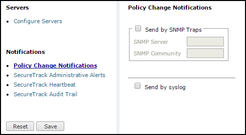 In this page you can set how SecureTrack sends change notifications and alerts, and whether an ongoing syslog audit trail is maintained. The supported notification and audit trail mechanisms are: