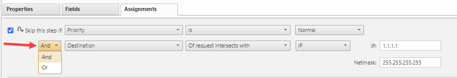 To skip a Business Owner Approval step when the target of the request is a specified device in the internal IT segment, select the Skip this step if: option, select the Target and Of request matches and select the device.