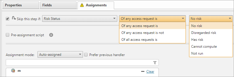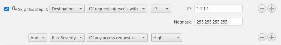 For tickets containing multiple access requests, the step will be skipped if the condition is met in any one of them, unless the condition selected specifically states that it applies to all access requests in the ticket. This option is available only on some types of conditions (e.g. Risk Status,Target, and Verifier Status).