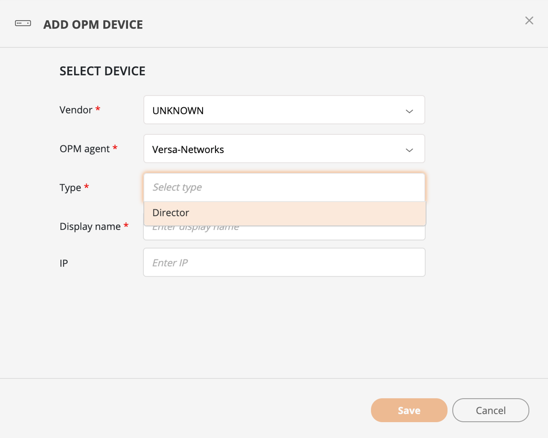 OPM agent: Select Tufin-Versa-Networks. The agent is displayed only if it was installed successfully.