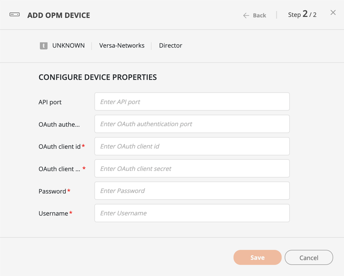 OAuth client secret*: The secret provided with your client ID. See how to create OAuth credentials in the Versa Director REST API.