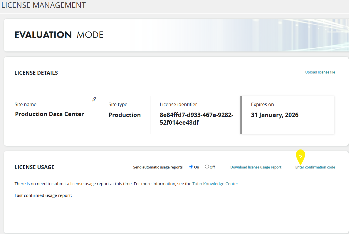 Return to the Licenses page, and in the License Usage section, click Enter Confirmation Code.