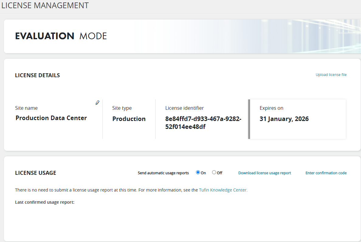 The License Management page displays your solution tier and the details of the license you purchased. This page is only available to administrator and super administrator users. All notifications and warnings that relate to licenses are displayed on this page. For example, when your license is about to expire or if a license usage report has not been submitted in a long time.