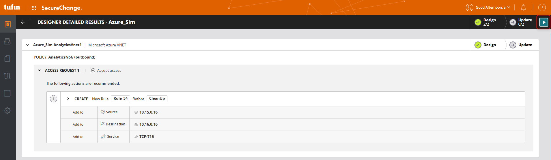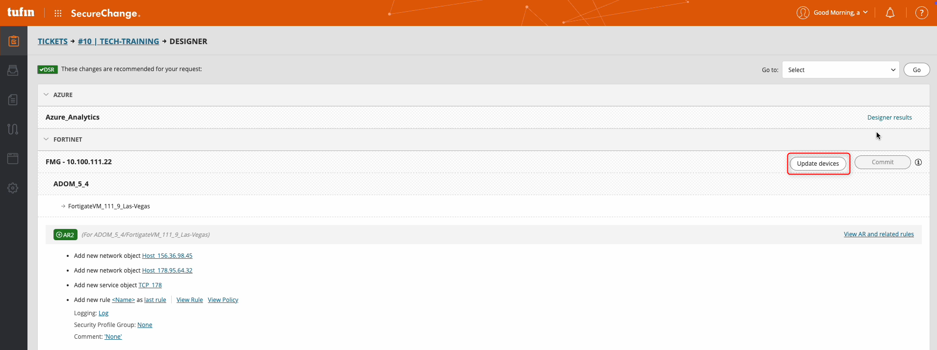 Designer’s suggestions are always based on the current revision of the device policy. Suggestions may become outdated when a new revision is received on the device, or when another ticket with Designer results is updated automatically using Update Device in SecureChange.