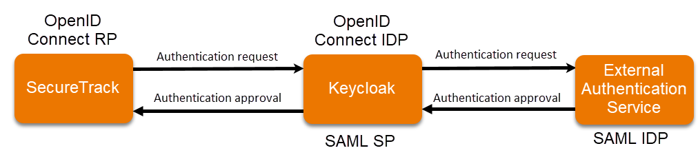 1. SecureTrack is the RP for OpenID Connect. It redirects authentication requests to Keycloak, the internal IDP for OpenID Connect.