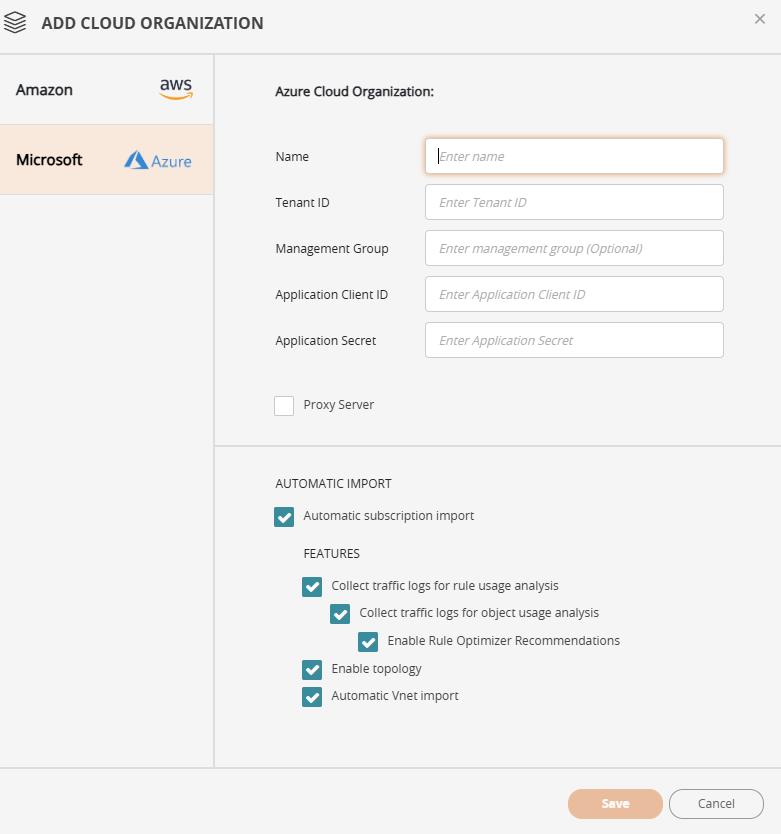 The table below describes the Cloud Organization settings specific to Microsoft Azure.
