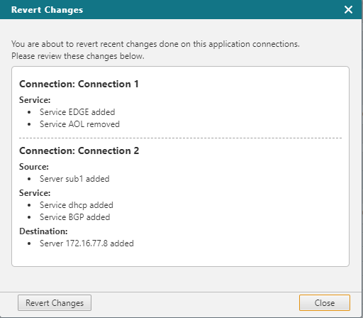 Revert Changes: Click this button to automatically revert all the changes done on the application connections since the last ticket submission. When you click this button, you'll see a list of changes that you can review.