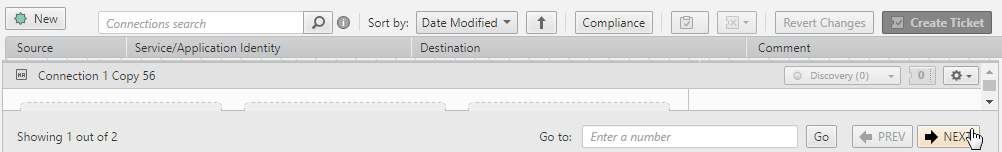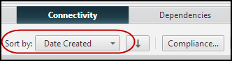 Sort the connections: You can sort the connections by these criteria: Name, Date created, Date modified, Status, Tickets, Application, Discovered (Discovery status), Comments. To sort the connections, select from the Sort by dropdown box and click the ascending or descending arrow.