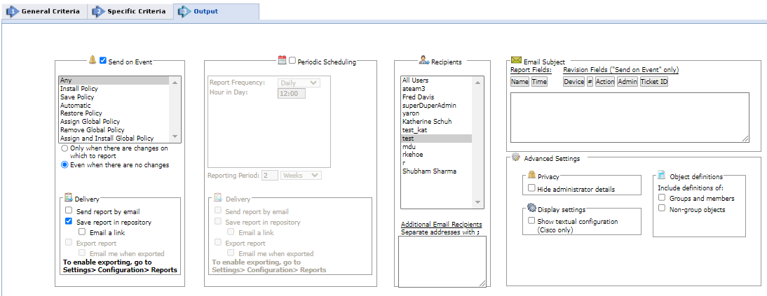 - Revision Fields: When the report is configured to Send on Event, you can include the name of the device, the revision number, the action that triggered the notification, the name of the administrator who did the action, and the ticket ID associated with the change in the new revision.