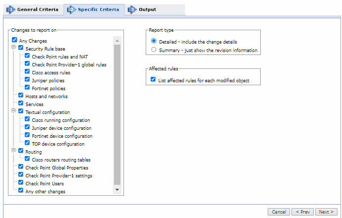 To include all changes, select Any Changes. To limit the report to include only changes to specific parts of the policy, such as rules, host, global properties, select what to include in the report. Report type
