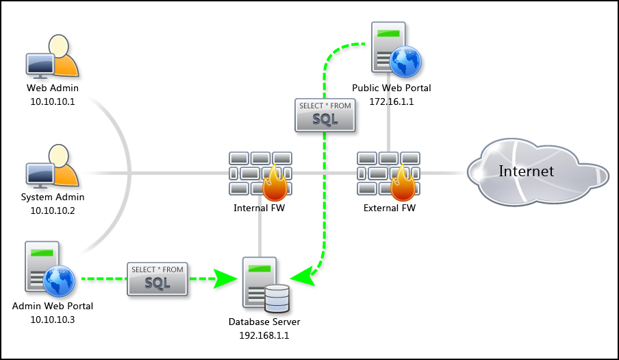 Let's say your business generates revenue from a web application that has a portal for public access and a portal for administrative access. The public portal (172.16.1.1) runs on a web server that is located in your DMZ network, and the administration portal (10.10.10.3) runs on a web server that is located in your internal network. Both web servers send queries to a database server (192.168.1.1) that is located in a separate internal segment of your network.