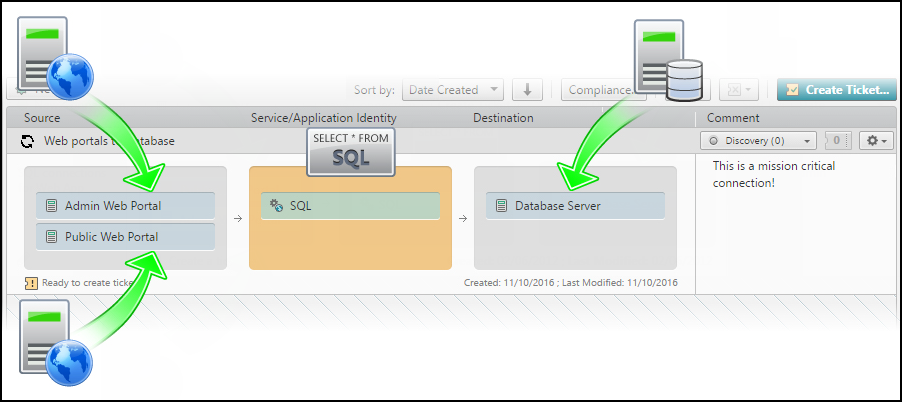 Visibility and control: Receive real-time visibility into business applications with a central repository of all application connectivity requirements, along with current connectivity status, and any open SecureChange tickets.