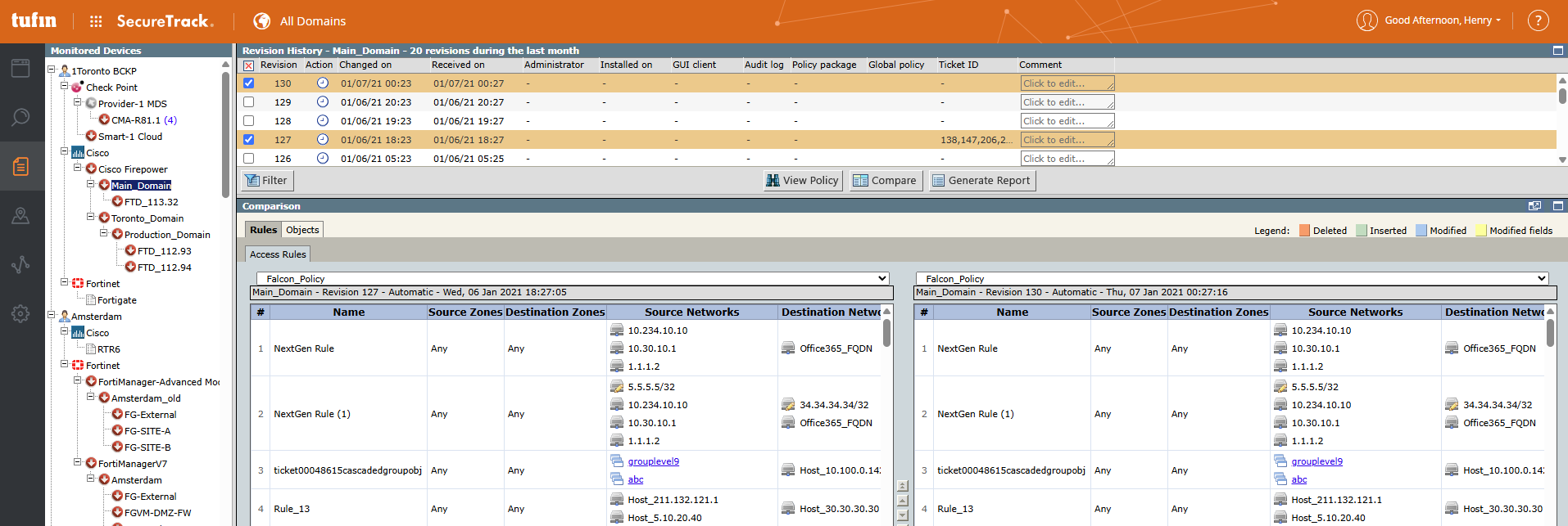 Compare Revisions to analyze configuration revisions and identify policy changes.
